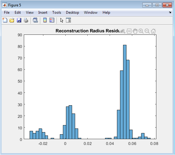 Figure 6 presents a quantitative histogram of the reconstruction performance. It shows the distribution of differences (residuals) between the average true radius of a track’s hits and the radius fitted by the reconstruction algorithm. The width of this distribution, centered near zero, directly measures the spatial resolution of the tracking system. A narrow, symmetric distribution indicates a successful and precise reconstruction, while biases or broad tails would reveal limitations in the fitting method or the impact of excessive noise. This figure translates the visual fuzziness of Figure 4 into a concrete, statistical metric of the simulator’s capability.