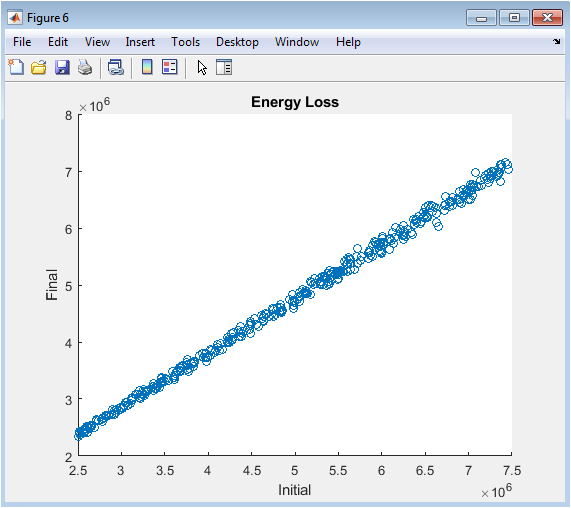 Figure 7 analyzes the simulated effect of particles traversing the detector material. It is a scatter plot of each particle’s initial momentum against its final momentum after the cumulative application of the simplified energy loss model. The points deviate below the diagonal line of equality, illustrating the stochastic energy loss process. The spread in final momentum for a given initial value represents the probabilistic nature of ionization loss. This visualization confirms the implementation of the material interaction model and shows how the detector itself alters the very property particle momentum it is designed to measure, a critical consideration in real experiments.