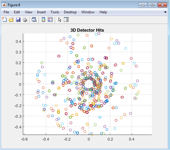 Figure 8 shows a histogram of how many detector layers recorded a hit for each generated particle. This distribution is influenced by the detector geometry, the particles’ angular distribution, and the efficiency of the intersection-finding algorithm. A peak at the maximum number of layers indicates that most central, high-momentum particles traversed the entire detector. Entries with fewer hits may represent particles with very high curvature (low momentum) that spiral out early or particles directed nearly parallel to the beam axis. This figure is key for diagnosing geometric acceptance and understanding what fraction of events are reconstructible (typically requiring a minimum of three hits).
