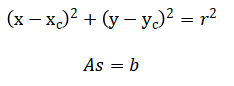 Finally, track parameters are reconstructed by solving the linearized circle equation, recast as for a least-squares fit to extract the radius (r) and center (x_c, y_c).
