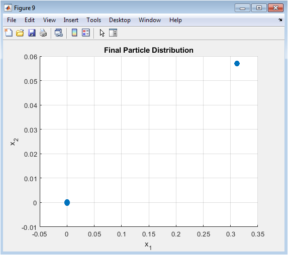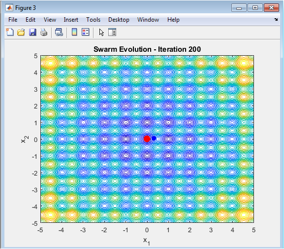 This scatter plot shows the end state of the optimization, displaying the positions of all particles at the final iteration. It acts as a direct visual comparison to Figure 3, revealing how the initially random, dispersed swarm has been reshaped by the optimization process. In a successful run, particles should be densely clustered around the global optimum at the origin, demonstrating effective convergence. The tightness of the cluster indicates the precision of the final solution, while any outliers might suggest residual exploration or particles trapped in separate local optima. This final snapshot encapsulates the outcome of the swarm’s collective intelligence and search dynamics.