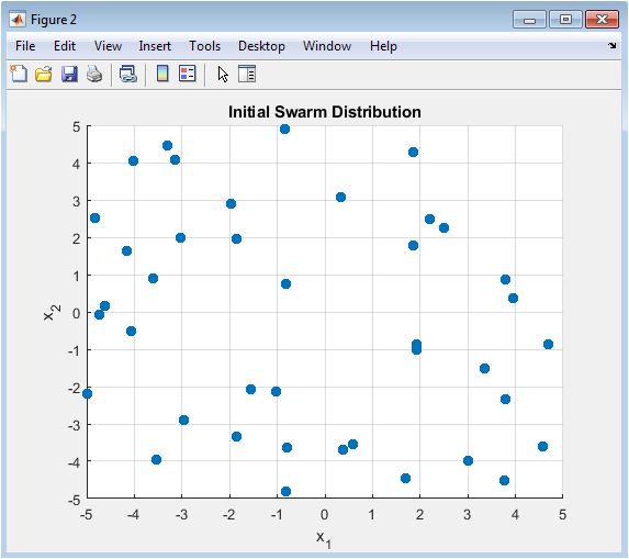 This scatter plot captures the starting state of the Particle Swarm Optimization algorithm, showing the initial random placement of all 40 particles within the two-dimensional search domain. Each particle’s position is a candidate solution, uniformly sampled between the lower and upper bounds to ensure a broad, unbiased coverage of the problem landscape at generation zero. The random initialization is a critical stochastic element that influences the algorithm’s early exploration phase. The figure serves as a baseline for comparison against the final distribution, illustrating the starting diversity and dispersion. By visualizing this initial random seeding, viewers can appreciate how the swarm begins its search from a state of maximum ignorance, with no prior knowledge of the function’s topology or the location of the global optimum.