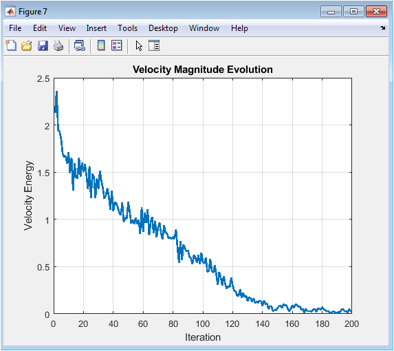This figure charts the average kinetic energy or magnitude of the particles’ velocity vectors over time. Initially, velocities are typically high as particles explore the search space with large steps, driven by high inertia and discoveries. As the algorithm progresses and the inertia weight decreases, the velocity energy generally decays, reflecting a shift to smaller, more precise movements for local exploitation near good solutions. A plot that drops to near-zero too quickly may indicate premature convergence and loss of search momentum, while persistently high velocity might suggest excessive oscillation without refinement. This metric provides insight into the swarm’s dynamic activity level and search intensity.