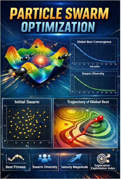 This integrated mathematical framework translates algorithmic operations into both visual trajectories and analytical plots, providing a complete, real-time representation of the optimization process. The core movement of each particle is governed by three key forces. First, the inertia component preserves a fraction of the particle’s previous velocity, giving it momentum in its current direction. Second, the cognitive component attracts the particle toward the best position it has personally ever found, representing memory and individual learning. Third, the social component pulls the particle toward the best position discovered by the entire swarm, enabling collective intelligence. These three influences are weighted by coefficients and randomized to create stochastic exploration. The new velocity is the sum of these three vectors, which is then capped to prevent excessive jumps. The particle’s position is updated by simply adding this computed velocity. To ensure a focused search, the inertia weight is programmed to decrease linearly over time, shifting the swarm’s emphasis from broad exploration to localized exploitation. Throughout the process, particles are kept within the predefined problem bounds. This set of simple, interacting equations gives rise to the complex emergent search behavior that characterizes the entire swarm.