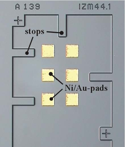 On the substrate wafers Ni/Au pads were deposited using electroplating of 5 µm thick Ni pads and sputtering for the 200 nm thick Au finish. The substrates are designed such that the Ni/Au pads sit in 40 µm deep etched cavities. In Figure 1 a photograph of a test substrate is shown. There are 6 Ni/Au pads surrounded by 4 stops acting as spacers and crosses acting as alignment marks in the corners.