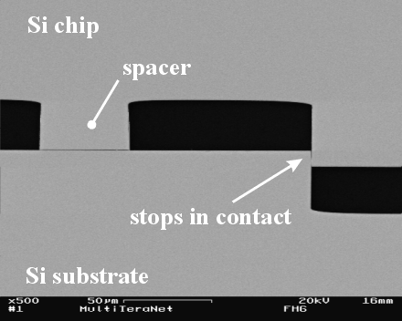 First flip chip assembly tests have shown that it is possible to use the self-alignment mechanism in combination with mechanical stops. The chip moves until it is stopped through the stops, i.e., the final position of the chip in regard to the substrate is determined solely by the stops.