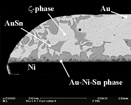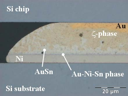 - It can clearly be seen that there is still an attractive arrangement of more than 30 µm left between the bump’s Au layer and the Ni pad on the substrate even though the chipmoveduntil it was stopped by the mechanical stops and the stops are in direct contact to each other. In Figure 12 as well as in Figure 16 the SEM image clearly shows the well wetting on the Ni pads. Intermetallic phases which formed during soldering are visible. Due to the dissolution of some nickel in the solder the microstructure becomes coarse compared to the pure eutectic composition of the Au/Sn solder bumps. The solder joint still consists of the intermetallic phases AuSn and Au5Sn (z-phase).
