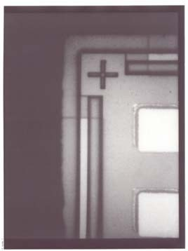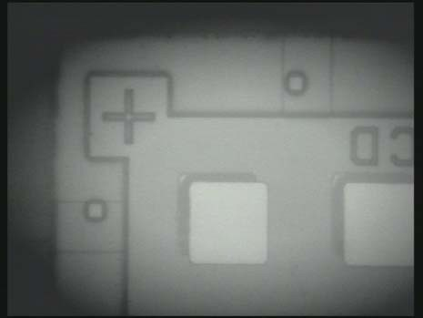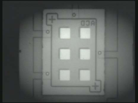 Figure 7 shows an IR image of the same sample after reflow soldering was performed and Figure 8 a magnification. The chip moved until it was stopped by the mechanical stops. Although the resolution of the IR microscopy is insufficient to prove whether or not the required alignment accuracy was achieved it is a suitable means of showing that the chip has moved towards the stops and is at least very close to its desired position. It can also be seen that there is still a distortion of the solder bumps after the chips moved towards the stops.