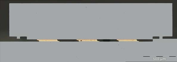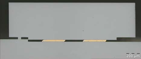 | Figure 13: IR image of self-aligned flip chip assembly with long stops. | Figure 14: Cross-sections self-aligned chip assembly of Figure 13 (top) and enlarged view on AuSn bump (bottom). | |