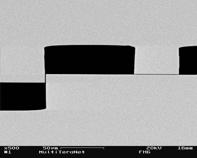 In Figure 13 another type of stop is shown which extends along the full side. The successful self-alignment can be recognized in the cross-section in Figure 14 where the enlarged bump structure is visible. The mechanical stop is presented in detail in Figure 15. There is a very small gap between the stop and the corresponding edge visible which is around 1 µm. This might be an indication, that mechanical stops of small dimension are favored over extended stop types.