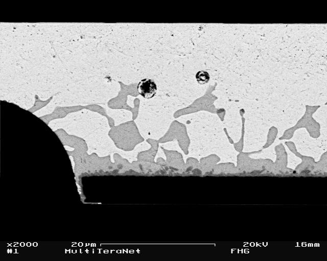 | Figure 11: Cross section light microscope image of a flip chip solder joint. | Figure 12: Cross section SEM image of a flip chip solder joint. | |