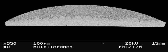 The shape of the bump, i.e. the height of the total bump and the thickness of the eutectic cap as well as the height of the remaining Au layer beneath the eutectic solder cap, was carefully adjusted by calculating the heights of the Au and Sn layers deposited. In previous work it has been shown that it is possible to predict the shape of the Au/Sn bumps using the volume equation of cut spheres5. Applying this calculation a Au layer of 17 µm and a Sn layer of 7 µm thickness were plated, i.e., the total thickness of the bumps as plated was 24 µm. This leads to a calculated bump height of 38 µm after reflow consisting of a remaining Au layer of 5 µm, a z-phase layer thickness of also 5 µm and a eutectic cap on top of the bumps of approximately 28 µm in height. The cross sections shown in Figure 3 and in Figure 4 reveal that the cap height achieved as well as the thickness of the z-phase and the thickness of the remaining Au layer fit well to the calculation.