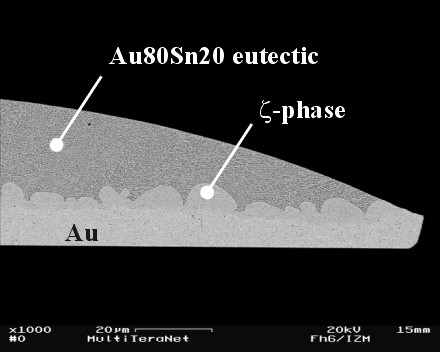 - Figure 4: Cross section SEM image of a Au/Sn bump after reflow. The bump consists of a Au layer and a eutectic solder cap on top and a layer consisting of the intermetallic z-phase in between.