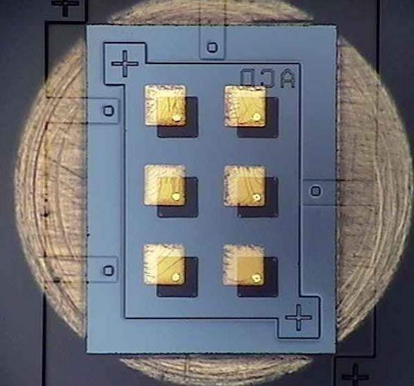 | Figure 1: Photograph of a Si test substrate with Ni/Au pads. | Figure 2: SEM photograph of a Si test die. Stops were etched using Reactive Ion Etching. The AuSn bumps on the die were reflowed after electroplating |