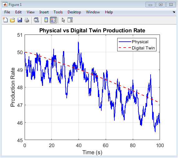 The ultimate test of a digital twin’s efficacy is its synchronization error the divergence between its predictions and the actual behavior of the physical system. Our simulation is designed to validate this core function. We run the physical process model (with its disturbances and noise) in parallel with the digital twin (with its Kalman Filter corrections) and directly compare key states like production rate. A low, bounded synchronization error demonstrates successful twin calibration and effective state estimation. Furthermore, this tight coupling enables a powerful anomaly detection mechanism [25]. By defining a normal operating envelope based on the twin’s predictions, any significant and persistent deviation of the physical process from this envelope can be flagged as an anomaly. This could indicate a sensor fault, a process fault (like a sudden bearing failure not yet captured by the slow wear model), or an external intervention. The digital twin thus acts as a continuous hypothesis test, asking “Is the system behaving as my model expects?” This capability for early and contextualized anomaly detection is a key step towards fully autonomous process monitoring and resilient manufacturing systems [26].