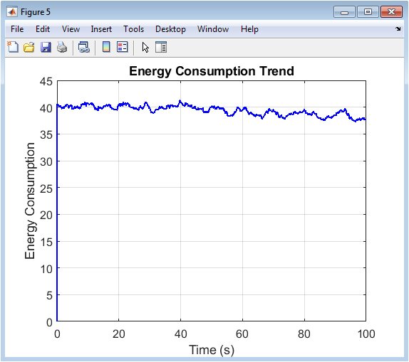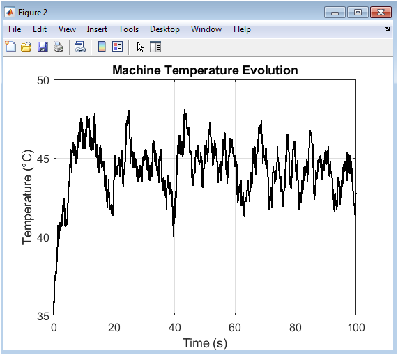 This plot shows the simulated energy consumption of the manufacturing process, calculated as a linear combination of the production rate and the machine temperature. The trend closely follows the production rate profile from Figure 1 but is modulated by the thermal load, demonstrating that energy use is multi-factorial. Periods of high production coincide with energy peaks, while the influence of temperature adds a secondary, slower-varying component. Monitoring this profile is essential for energy efficiency analysis and sustainability reporting. Deviations from the expected energy-for-production ratio could indicate issues like increased friction from wear, bearing failures, or cooling system inefficiencies. Therefore, this metric provides not only operational cost data but also serves as an additional, integrated health indicator. By correlating energy spikes with other process variables, the digital twin can help identify root causes of inefficiency and guide optimization efforts to reduce the carbon footprint and operational expenses.
