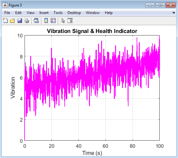 The vibration signal, shown here, is a synthesized health indicator that combines the effects of production activity and machine degradation. Its value is calculated as a linear combination of the instantaneous production rate and the accumulated tool wear, with added measurement noise to simulate a real sensor reading. As tool wear progresses, its contribution to the vibration level increases, causing the signal’s baseline to rise over time despite fluctuations from production changes. This makes vibration a crucial prognostic metric; an upward trend in mean vibration or an increase in signal variance often precedes outright failure. The plot allows for the visual identification of degradation onset by observing when the signal ceases to return to its original baseline. Analyzing this time-series data enables condition-based monitoring, where maintenance can be triggered by statistical deviations in vibration rather than by simple runtime. Thus, this figure illustrates the role of vibration as a direct, measurable proxy for the machine’s mechanical health.