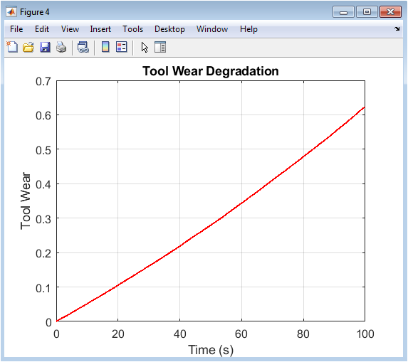 This figure presents the progressive degradation of the machine tool, modeled as a monotonic, cumulative function of the absolute vibration experienced at each time step. The wear profile is not linear; its rate of accumulation accelerates slightly as the system operates because increased wear leads to higher vibration, which in turn accelerates further wear a classic positive feedback loop indicative of many mechanical failure modes. The absence of noise in this curve is intentional, as wear is treated as a hidden state variable that is not directly measured but is inferred from other sensors (like vibration) and models. Tracking this estimated wear is the cornerstone of predictive maintenance, as it allows for the forecast of remaining useful life. By setting thresholds on this wear value, maintenance actions can be scheduled proactively before the wear reaches a critical level that causes quality loss or catastrophic failure, thereby minimizing unplanned downtime.