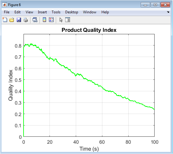 The Product Quality Index, derived from the estimated states of tool wear and machine temperature, is plotted here. The index is formulated to decay exponentially with increasing tool wear and with deviations of the temperature from an ideal setpoint (60°C in this model). The resulting curve shows a generally declining trend, primarily driven by the irreversible accumulation of tool wear, superimposed with smaller recoveries and dips corresponding to temporary improvements or worsening in temperature control. This visualization directly links process conditions to the final product’s expected quality, enabling predictive quality assurance. A key insight is that quality can degrade significantly even while production output remains stable, highlighting the need for separate quality monitoring. This predictive capability allows operators to anticipate batches that may fall out of specification and to adjust process parameters or schedule tool changes proactively to maintain yield and reduce scrap.