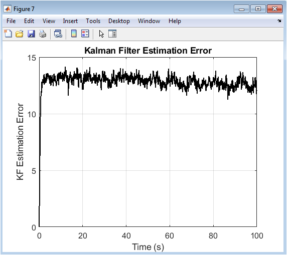 This figure quantifies the performance of the Kalman Filter by plotting the norm of the estimation error the difference between the noisy sensor measurements and the filter’s optimal state estimates over time. The error does not converge to zero, reflecting the persistent presence of measurement and process noise that cannot be perfectly eliminated. However, the error remains bounded and relatively stable, demonstrating the filter’s effectiveness in providing consistent, accurate state estimates despite the noisy environment. Transient spikes may occur following significant unmodeled disturbances. The stability of this error is critical for the digital twin’s reliability; a diverging error would indicate a poorly tuned filter or a model that is fundamentally mismatched to the physical process. Thus, this plot serves as a vital diagnostic for the data fusion layer, confirming that the digital twin’s “view” of the system is both accurate and robust.