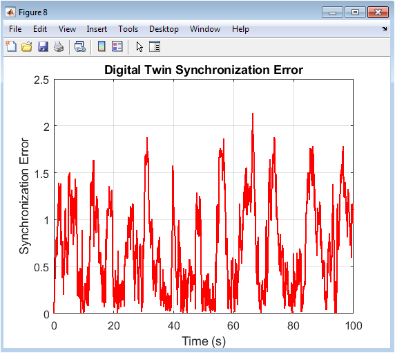 This final plot displays the absolute synchronization error between the physical system’s production rate and the digital twin’s predicted production rate, which is the direct numerical difference underpinning the comparison in Figure 1. It provides a clear, quantitative measure of the digital twin’s fidelity over the entire simulation. The error magnitude shows how closely the twin tracks the physical process, with lower values indicating better synchronization. The presence of a non-zero, varying error highlights the inherent challenge of maintaining perfect alignment with a stochastic, evolving physical system. Analyzing this error profile can inform model improvement efforts, such as refining the physics-based equations or adjusting the Kalman Filter parameters (Q and R matrices). Ultimately, minimizing this synchronization error is the ongoing goal of digital twin calibration, ensuring the virtual model remains a trustworthy basis for simulation, optimization, and prediction.