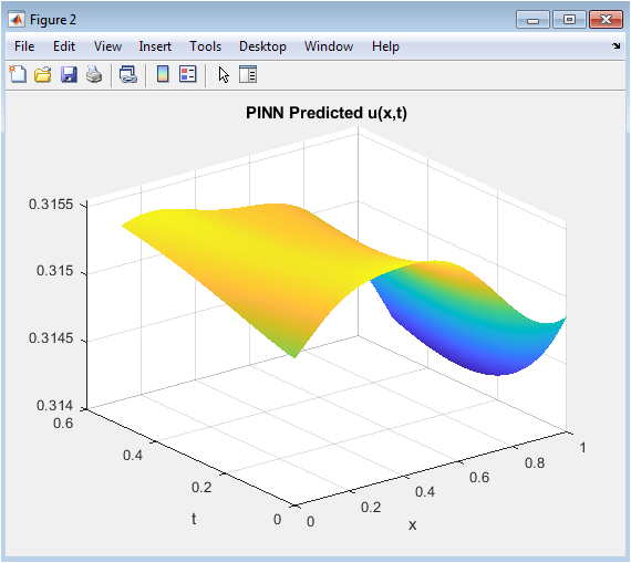 This surface plot visualizes the solution predicted by the trained PINN over the spatial domain  [0,1] and temporal domain  [0,0.5]. The x-axis represents spatial points, the y-axis represents time, and the z-axis shows the predicted temperature values. The smoothness of the surface indicates that the network learned a continuous approximation of the heat equation solution. Peaks and valleys reflect the initial sinusoidal condition and its exponential decay over time. This visualization allows one to assess the overall accuracy of the solution in the spatio-temporal domain. The figure also helps identify regions where the prediction may slightly deviate from the exact solution. It is particularly useful for understanding the dynamics of diffusion captured by the PINN. The absence of discontinuities confirms that the network output is stable and differentiable.