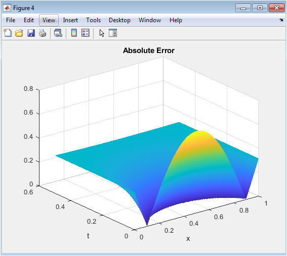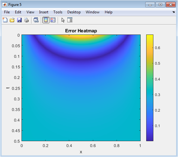 This heatmap provides a top-down view of the error distribution across the spatial-temporal domain. The x-axis is space, the y-axis is time, and the color represents the magnitude of the absolute error. Darker colors indicate higher errors, while lighter colors show regions of accurate predictions. It offers a quick visual summary of where the network performs well and where minor discrepancies exist. This 2D representation complements Figure 4, making it easier to interpret localized errors. The heatmap can reveal patterns, such as slightly higher errors near the initial or boundary points. Overall, it confirms the PINN’s robustness and uniform accuracy over most of the domain.