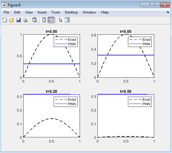The neural network is a fully connected feedforward network with three hidden layers of 50 neurons each, using the activation function. A layer graph is constructed and converted into a `dlnetwork` object, allowing automatic differentiation for gradient computation. The training loop uses the Adam optimizer to minimize a composite loss function consisting of the mean squared error of the initial condition, boundary conditions, and the PDE residual at collocation points. The PDE residual is computed using automatic differentiation, where first and second derivatives with respect to the normalized spatial and temporal coordinates are obtained. Tsoulos et al. solved differential equations with constructed neural networks [18]. The network is trained for 6000 epochs, and the training loss is recorded. After training, the network is evaluated on a uniform grid to predict the solution, which is then compared with the exact solution. The code generates six plots: the training loss curve, PINN-predicted solution surface, exact solution surface, absolute error surface, error heatmap, and a time-slice comparison of PINN predictions versus the exact solution at selected times. Overall, this script demonstrates how PINNs incorporate both data and governing physical laws to achieve accurate solutions without requiring explicit discretization of the PDE. The functions `exact`, `lossFun`, and `mse` modularize the code, making it easy to adapt to other PDEs or network architectures. By enforcing the physics through automatic differentiation, the PINN ensures that the learned solution satisfies the heat equation across the entire spatio-temporal domain. This approach is especially powerful for problems where data is limited or traditional numerical methods may be computationally expensive. The code is fully vectorized for efficiency and leverages MATLAB’s deep learning framework for gradient calculations, training, and evaluation. The combination of collocation points, boundary conditions, and initial conditions forms a robust training set, ensuring accurate and stable predictions. Overall, this script illustrates the practical implementation of PINNs for solving classical PDEs in a flexible and modular manner.