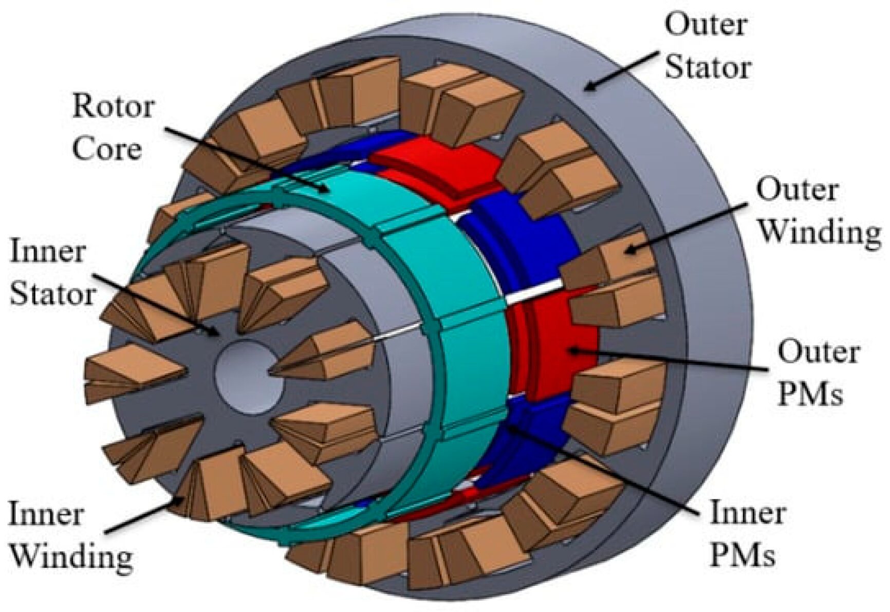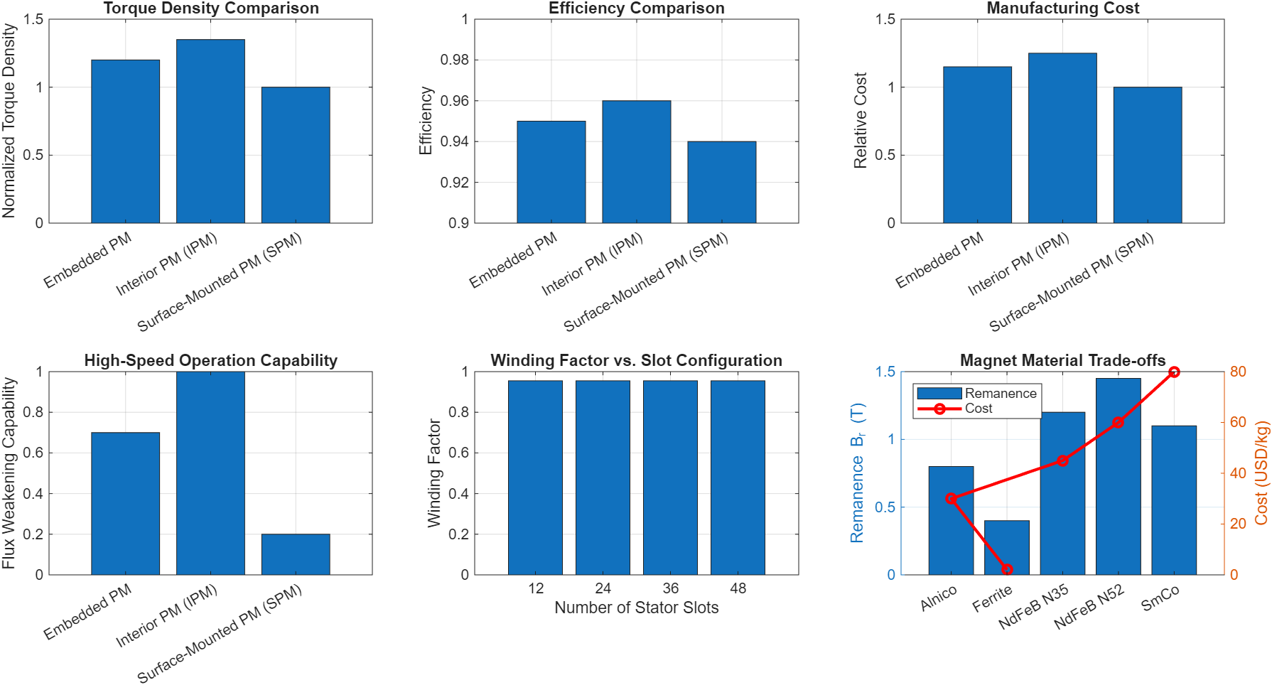 - Design Principles: Systematic evaluation of rotor configurations (Surface-Mounted PM, Interior PM, and Embedded PM), stator geometry optimization, and magnet material selection [7].