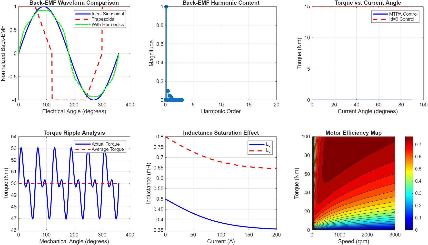- Electromagnetic Performance: Detailed analysis of back-EMF characteristics, torque production mechanisms, magnetic saturation effects, and efficiency mapping using analytical and numerical methods [8].
