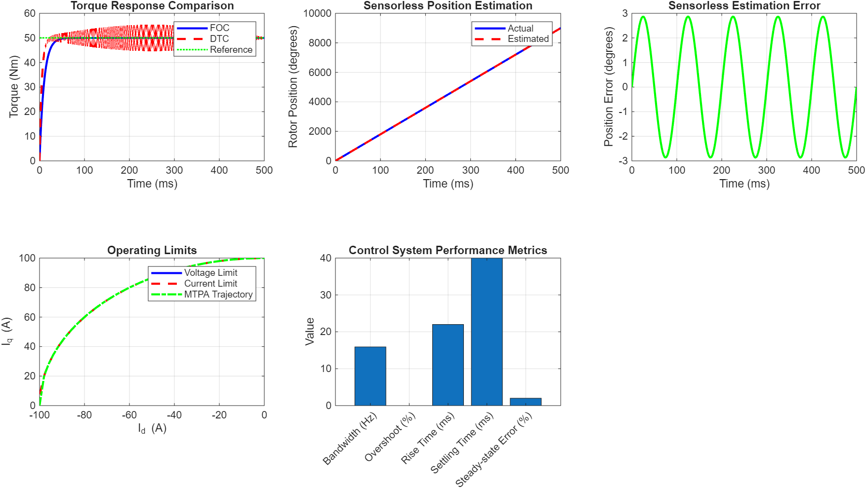 - Control Integration: Assessment of control strategy impacts on motor performance, including FOC and DTC implementations, sensorless operation feasibility, and dynamic response characterization [10].