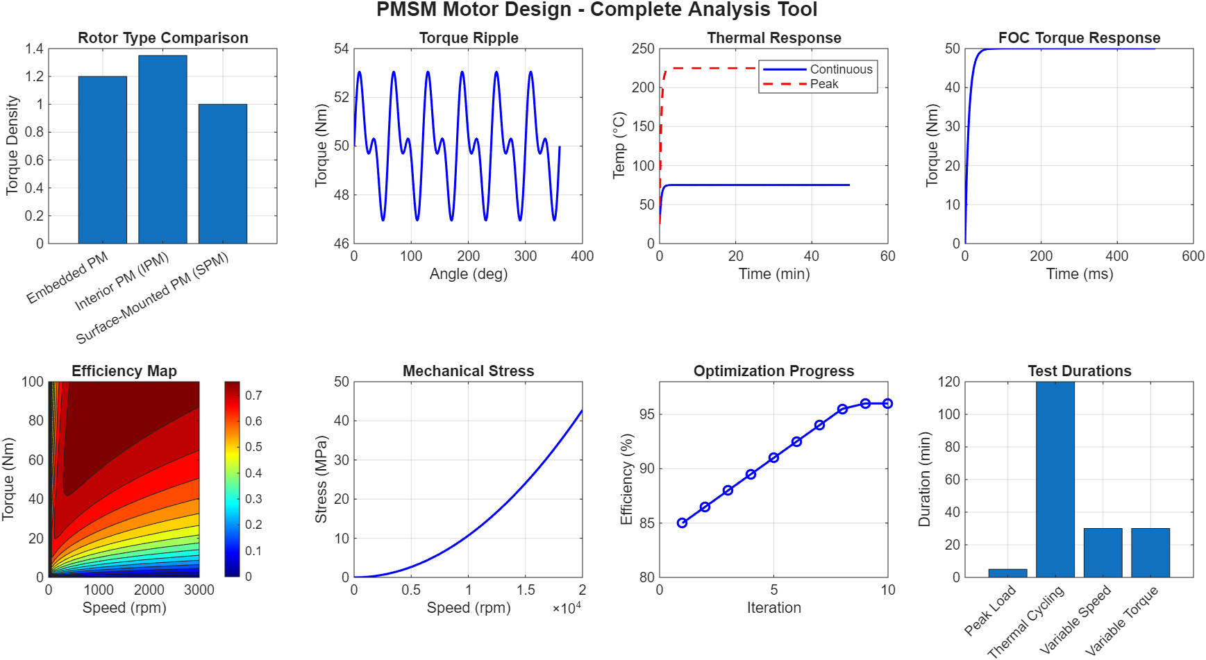 This research presents a comprehensive methodology for PMSM design, analysis, and optimization throughout the complete development lifecycle. The key findings and contributions include: