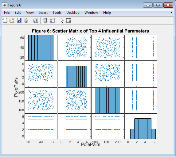 Figure 8 presents a scatter matrix showing pairwise relationships between the top four most influential parameters identified by PRCC. Each subplot displays one parameter against another, with diagonal plots showing the distribution of individual parameters. The figure helps visualize interactions between top design variables and their combined effect on vibration. Patterns such as linear or nonlinear trends, clustering, or outliers become evident. It highlights potential trade-offs, for example, between air-gap length and magnet thickness. Designers can interpret how simultaneous adjustments of multiple parameters affect vibration. The scatter matrix supports multi-variable optimization strategies. It also validates the independence or dependency assumptions used in statistical analysis. Overall, it provides a comprehensive view of the design space for informed PMSM optimization.