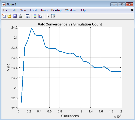 A common objection to Monte Carlo simulation in practice concerns computational burden. Simulating thousands of correlated paths across multiple assets over hundreds of time steps can be computationally intensive, particularly when nested within optimization routines or daily risk reporting cycles. Without careful attention to numerical efficiency, Monte Carlo methods risk being relegated to offline, quarterly exercises rather than real-time decision support tools. Our implementation incorporates several strategies to address these performance considerations. First, we vectorize all stochastic differential equation discretizations to minimize loop overhead and exploit MATLAB’s optimized matrix operations. Second, we implement antithetic variates, a variance reduction technique that generates symmetric pairs of random shocks, thereby doubling effective sample size with negligible additional computational cost [21]. Third, we explicitly model convergence dynamics by computing VaR estimates on progressively larger simulation subsets and visualizing the resulting stabilization curve. This convergence diagnostic serves two essential functions: it provides empirical confidence that the chosen number of simulations is sufficient for stable estimates, and it offers a quantitative basis for optimizing the trade-off between accuracy and runtime. For risk managers operating under production constraints, this analysis supports defensible decisions about simulation count and provides documentation for model validation and audit purposes.