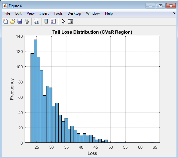 This histogram isolates and magnifies the extreme loss region of the portfolio loss distribution by displaying only those simulated outcomes where the loss exceeds the ninety-five percent Value-at-Risk threshold. By filtering the full twenty thousand simulations to retain approximately one thousand of the most severe loss events, this visualization focuses analytical attention exclusively on the tail region that determines economic capital requirements and drives risk management decision-making. The horizontal axis spans from the Value-at-Risk threshold at the left boundary through the most extreme simulated losses extending into the right tail, while the vertical axis displays the frequency count of observations within each loss interval. The shape of this conditional distribution reveals critical information about tail behavior that remains obscured in the full distribution histogram, including the rate at which extreme loss probability decays and the presence of particularly severe but plausible disaster scenarios. Expected Shortfall, also known as Conditional Value-at-Risk, is precisely the arithmetic mean of all observations displayed in this histogram, representing the expected loss magnitude conditioned on the occurrence of a tail event. The dispersion and skewness within this tail region determine the difference between Value-at-Risk and Expected Shortfall, with wider, more right-skewed tails producing larger divergence between these two risk metrics. This visualization enables risk managers to assess whether the portfolio exhibits particularly dangerous tail characteristics, such as a second mode at extreme loss levels or insufficiently rapid decay indicating infinite variance behavior. The figure also facilitates communication with non-technical stakeholders by making concrete the otherwise abstract concept of tail risk. For capital planning purposes, the tail loss histogram provides intuitive visualization of the loss scenarios against which regulatory and economic capital must provide cushion.