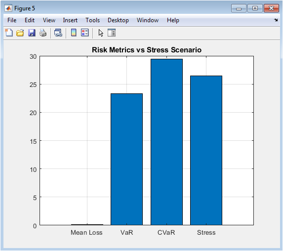 This bar chart provides direct visual comparison between four distinct risk metrics, placing baseline statistical estimates alongside a deterministic stress scenario for immediate benchmarking. The first three bars represent conventional risk statistics computed from the simulated loss distribution: the arithmetic mean loss representing expected performance, the ninety-five percent Value-at-Risk representing the regulatory capital standard, and the Expected Shortfall representing the coherent tail risk measure increasingly favored by sophisticated practitioners and regulators. The fourth bar displays the portfolio loss that would result from an instantaneous, simultaneous shock to all asset prices according to the predefined stress vector, simulating a severe market decline scenario comparable to historical crises. The visual juxtaposition reveals the relative severity of the stress scenario against baseline risk metrics, with the stress loss typically exceeding Value-at-Risk and approaching or surpassing Expected Shortfall depending on scenario calibration. This comparison enables risk managers to calibrate stress scenarios to appropriate severity levels, ensuring they represent plausible adverse conditions rather than routine fluctuations already captured within the Value-at-Risk confidence interval. The bar chart format facilitates immediate comprehension across diverse stakeholder groups, from trading desks to board committees, without requiring statistical literacy to interpret. Differences in relative heights across these four metrics communicate important information about portfolio characteristics: a stress loss substantially exceeding Expected Shortfall suggests the stress scenario captures tail dependencies or shock correlations not fully represented in the historical calibration of the Monte Carlo engine. This visualization anchors abstract probabilistic risk measures against concrete, narrative-driven scenarios that resonate more intuitively with business decision-makers. Regular production and review of this comparison chart supports compliance with regulatory expectations for integrated stress testing and scenario analysis under modern capital adequacy frameworks.
