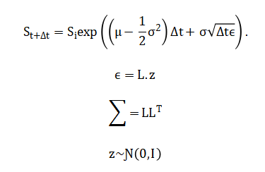 Where asset prices are simulated via the exact discretization Cross-asset dependence is introduced through correlated Wiener processes using Cholesky factorization of the correlation matrix, such that: