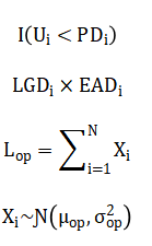Credit risk follows a Bernoulli mixture model wherein default events are generated as with associated loss given default while operational risk employs a compound Poisson process with frequency and severity.