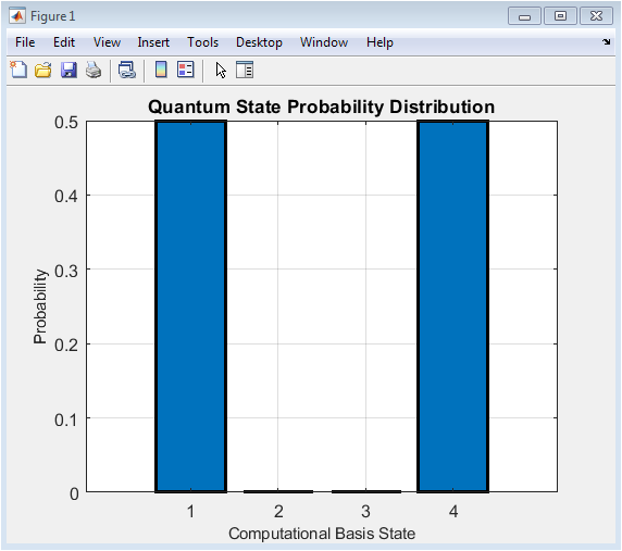 This figure shows the probability distribution of the quantum state after applying a Hadamard gate and a CNOT gate to the initial state |00. The x-axis represents the computational basis states, and the y-axis represents the probability of each state. The figure demonstrates the entanglement of the qubits, with non-zero probabilities for both |00and |11states. The probabilities are calculated using the absolute square of the wave function coefficients. The figure provides insight into the quantum state’s properties and behavior. The entanglement is evident from the non-zero probabilities of the correlated states. The figure is a crucial component of the study, demonstrating the principles of quantum computing. The probability distribution is a fundamental concept in quantum mechanics. The figure is used to analyze the quantum state’s properties and behavior. The results are relevant to various fields, including quantum computing and quantum information processing.