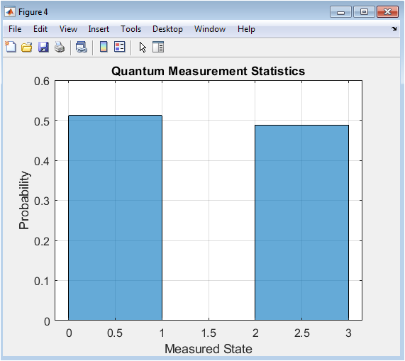 This figure shows the histogram of measurement outcomes, representing the probability distribution of the measured states. The x-axis represents the measured state, and the y-axis represents the probability. The figure demonstrates the statistical nature of quantum measurements, with probabilities approaching the theoretical values. The measurement outcomes are generated using Monte-Carlo simulations. The figure provides insight into the quantum measurement process and its statistical properties. The measurement statistics are a fundamental concept in quantum mechanics. The figure is a crucial component of the study, demonstrating the principles of quantum computing. The results are relevant to various fields, including quantum computing and quantum information processing. The figure is used to analyze the measurement process and its properties.
