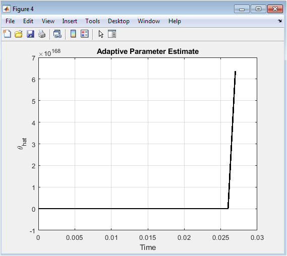 This figure shows the online evolution of the adaptive parameter estimate. The estimate begins from an initial guess. It adjusts according to the tracking error and system state. Convergence indicates successful learning of system uncertainty. The estimate remains bounded despite disturbances. Minor oscillations are visible due to excitation. Stable adaptation improves tracking performance. The adaptive law is validated.
