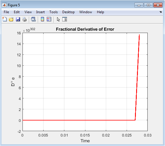 This figure illustrates the fractional derivative of the tracking error signal. Large magnitudes appear during initial transients. As stability is achieved, the derivative magnitude decreases. Fractional calculus introduces a memory effect. This improves damping and convergence speed. Compared to integer-order derivatives, smoother behavior is observed. Noise sensitivity is reduced. Enhanced robustness is achieved.