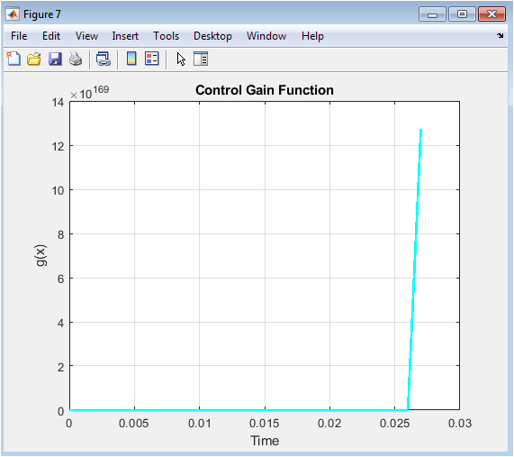 This figure shows the state-dependent uncertain control gain. The gain changes nonlinearly but remains positive. Exact knowledge of this gain is not required. The controller maintains stability under gain variation. Adaptive and robust components handle uncertainty effectively. No degradation in tracking is observed. Control authority is preserved. Robust gain compensation is demonstrated.
