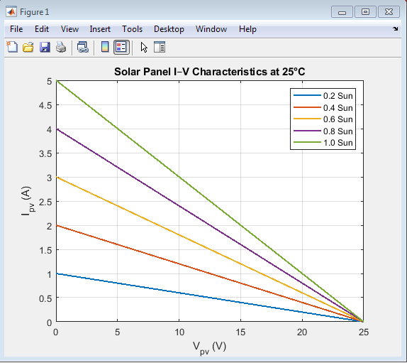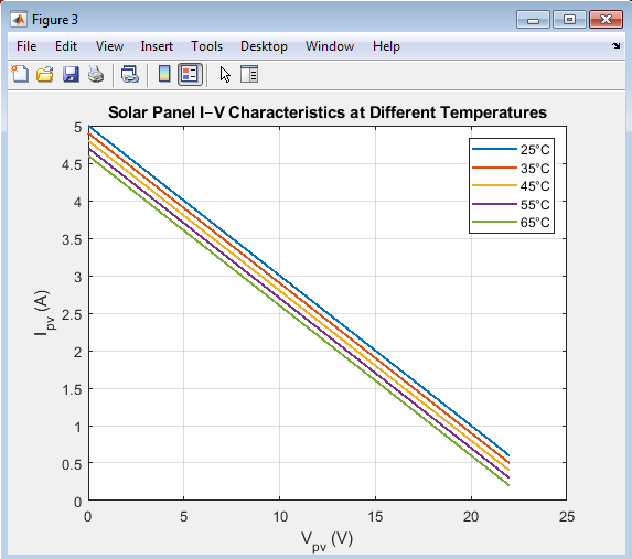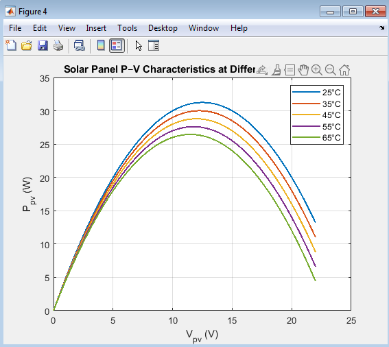 Figure3 illustrates the current-voltage (I-V) characteristics of a solar panel under varying temperature conditions, ranging from 25°C to 65°C. The plot shows the relationship between the voltage (Vpv) and current (Ipv) output of the solar panel at a fixed irradiance level of 1 sun. Each curve represents a different temperature, with the highest curve corresponding to 25°C and the lowest curve corresponding to 65°C.The plot demonstrates that increasing temperature affects the solar panel’s performance, typically leading to a decrease in voltage output. The curves show that as the temperature increases, the open-circuit voltage (Voc) decreases, while the short-circuit current (Isc) remains relatively constant. This behavior is characteristic of solar panels and is due to the temperature dependence of the semiconductor materials used in the panel. The I-V characteristics are useful for understanding the solar panel’s performance and efficiency under different temperature conditions. By analyzing the plot, one can determine the impact of temperature on the solar panel’s voltage and current output, which is essential for designing and optimizing solar energy systems for various environmental conditions.