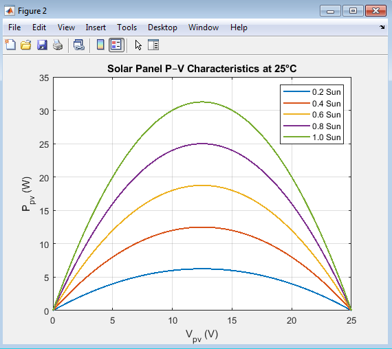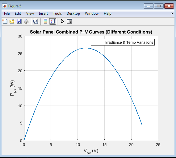 Figure 4 shows the power-voltage (P-V) characteristics of a solar panel under varying temperature conditions, ranging from 25°C to 65°C. The plot illustrates the relationship between the voltage (Vpv) and power output (Ppv) of the solar panel at a fixed irradiance level of 1 sun. Each curve represents a different temperature, with the highest curve corresponding to 25°C and the lowest curve corresponding to 65°C.The plot demonstrates that increasing temperature affects the solar panel’s power output, typically leading to a decrease in maximum power point (MPP) and a shift in the voltage at which the MPP occurs. The curves show that as the temperature increases, the power output of the solar panel decreases, which is due to the decrease in voltage output. The P-V characteristics are useful for understanding the solar panel’s performance and efficiency under different temperature conditions. By analyzing the plot, one can determine the impact of temperature on the solar panel’s power output and identify the optimal operating voltage and current for maximum energy production. This information is essential for designing and optimizing solar energy systems for various environmental conditions.
