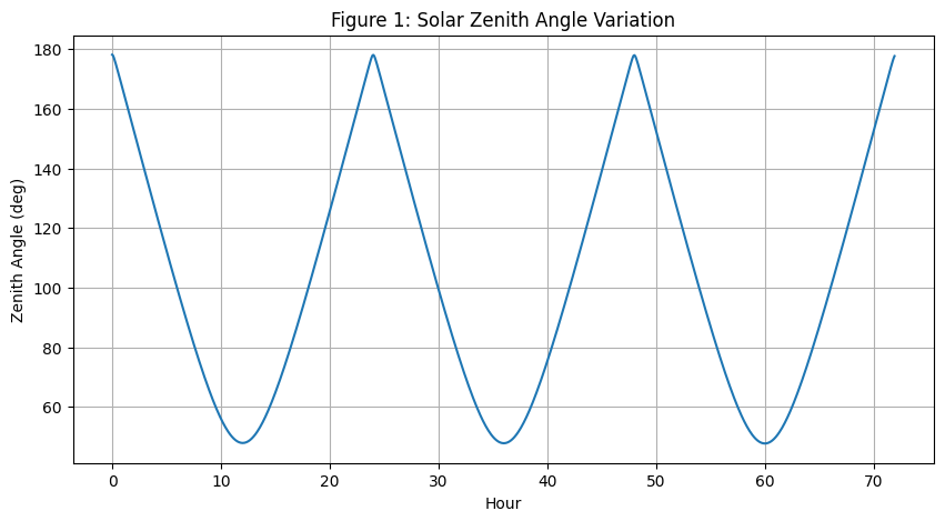 Figure 2 illustrates the variation of the solar zenith angle throughout the three-day simulation period. The zenith angle represents the angular distance of the sun from the vertical at the given location. Its value is lowest around solar noon, indicating that the sun is nearly overhead, and highest during early morning and late evening hours. This diurnal pattern repeats daily, reflecting the Earth’s rotation. Variations between days are minimal since the simulation covers only three consecutive days in the same season. The calculation is based on solar geometry, including declination, hour angle, and latitude. Accurate modeling of the zenith angle is critical because it directly influences the intensity of incident solar radiation on the panels. The figure highlights the periodic nature of solar motion and its impact on irradiance distribution. This visualization is fundamental for understanding the timing of peak PV output. It also provides insights into optimal panel tilt and orientation strategies for energy capture. Overall, it forms the first step in correlating solar position with system performance.