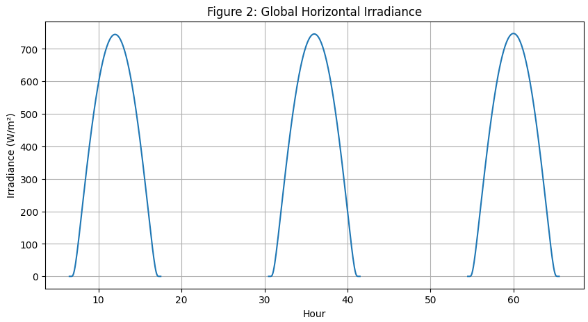 Figure 3 depicts the global horizontal irradiance reaching the Earth’s surface under clear-sky conditions. The GHI peaks near midday when the sun is highest in the sky and decreases toward sunrise and sunset. This pattern reflects the influence of the solar zenith angle on irradiance, where lower zenith angles correspond to higher energy reception. Atmospheric attenuation is incorporated using air mass calculations, which reduce irradiance when sunlight passes through a thicker portion of the atmosphere. The GHI curve shows a smooth sinusoidal shape, indicating clear-sky conditions without cloud shading. Over the three-day simulation, irradiance curves follow similar diurnal trends, providing a consistent baseline for PV energy calculations. This figure is essential for understanding the maximum available solar energy at the site. It serves as the input for plane-of-array calculations. By visualizing GHI, researchers can assess the potential energy generation and plan PV system sizing. It also allows comparison between modeled irradiance and real-world measurements for validation purposes.
