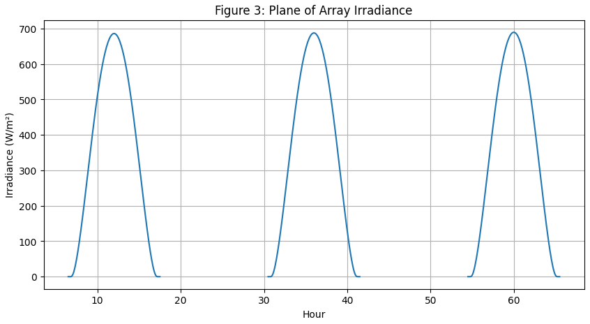 Figure 4 shows the plane-of-array irradiance, representing the solar radiation actually incident on the tilted PV modules. Unlike horizontal irradiance, POA accounts for the tilt angle of the panel, which optimizes energy capture throughout the day. The figure illustrates higher irradiance values around solar noon, when the sun is closely aligned with the panel surface. Morning and evening irradiance values are lower due to increased incidence angles. The POA calculation is derived by multiplying global horizontal irradiance with the cosine of the incidence angle between the sun and the panel surface. This adjustment ensures more realistic modeling of actual PV energy generation. Variations across the three days remain consistent, highlighting predictable diurnal trends. This figure helps quantify the energy available for conversion at the module level. It is critical for determining PV output and designing optimal tilt angles. By analyzing POA, engineers can estimate maximum power output periods. It also forms the basis for integrating thermal and MPPT effects into power modeling.
