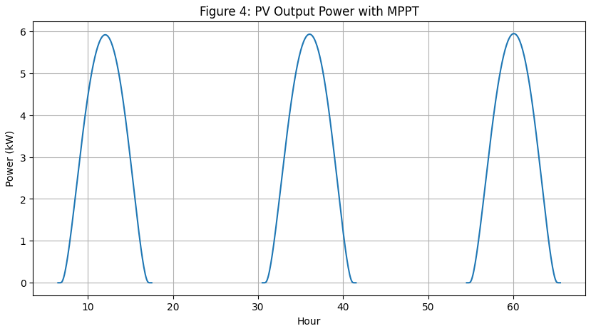 Figure 5 presents the electrical power output from the PV system after applying maximum power point tracking. MPPT ensures that the PV modules operate at their optimal voltage and current combination to maximize energy extraction. The power output follows a bell-shaped daily pattern, peaking during solar noon when incident irradiance and panel alignment are most favorable. Early morning and late evening outputs are significantly lower due to low POA irradiance. The figure accounts for temperature-dependent efficiency, reflecting the reduction in power during periods of high cell temperature. Small variations in peak power between consecutive days are visible, caused by changing zenith angles and daily irradiance profiles. This figure provides a direct visualization of usable energy production. It allows researchers to assess system performance and identify peak generation hours. Understanding PV power dynamics is critical for designing battery storage and grid integration. The figure also supports evaluation of capacity factor and performance ratio metrics for system efficiency.