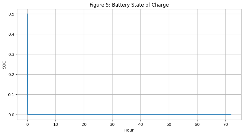 Figure 6 illustrates how the battery’s state-of-charge evolves over the simulation period in response to PV power generation and load demands. The SOC increases when PV generation exceeds the load, indicating battery charging periods. Conversely, it decreases when load demand surpasses PV output, representing discharge to support energy balance. The sinusoidal load profile causes regular charging and discharging cycles, reflecting daily energy management patterns. The figure demonstrates the battery’s ability to store excess energy and supply power during low PV generation periods. Efficiency losses during charging and discharging are included, slightly reducing net SOC changes. Over the three days, SOC remains within safe operational limits, demonstrating stable storage performance. This visualization helps in sizing battery capacity for reliability. It also highlights the role of storage in smoothing power delivery to the load. The SOC dynamics are essential for hybrid PV-grid energy planning and smart grid applications. The figure provides insights into optimal storage utilization strategies.